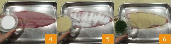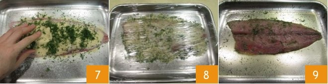 place the fillet in a baking dish and sprinkle the entire surface first with salt 4, then with brown sugar 5, and finally with finely chopped dill 6.