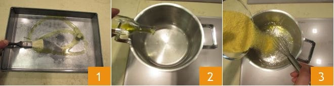 To prepare the amuse-bouche of polenta and scallop, start by pouring 1 tsp of oil into a baking pan with dimensions of 11x8 inches and set it aside 1. Meanwhile, put a pot with water on the heat. When it boils, adjust the salt and add about 2 tsp of oil 2, then pour the instant polenta flour while stirring vigorously with a whisk (or a wooden spoon) to avoid lumps 3.