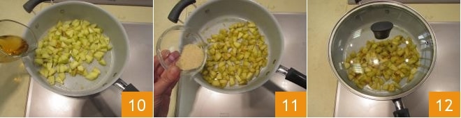 Adjust with salt and pepper and cook for 3-4 minutes on high heat, deglaze with brandy and let it evaporate (be very careful of possible flames!) 10. Add the brown sugar and let it caramelize for a few minutes 11; at this point, the apples will be ready, so cover them with the lid and set them aside 12.