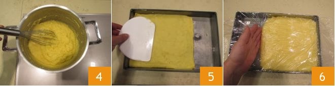 Continue stirring constantly for 8 minutes to obtain a consistent and dry polenta 4. Then transfer the polenta onto the tray and level it with a spatula until it reaches a thickness of 1/5 inch, without spreading it over the entire surface 5. Cover with plastic wrap and let cool in the fridge for 20 minutes 6.