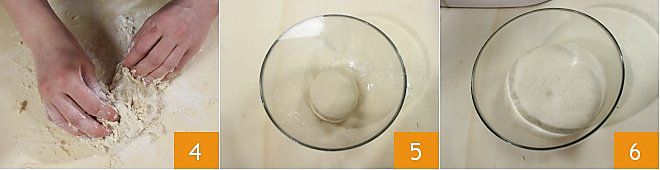 Transfer the dough to a surface and begin kneading until you form a smooth and uniform ball which will be your starter 4. Place the starter in a bowl, cover the bowl with plastic wrap 5, and let it rise in a turned-off oven with the light on until it doubles in size 6.
