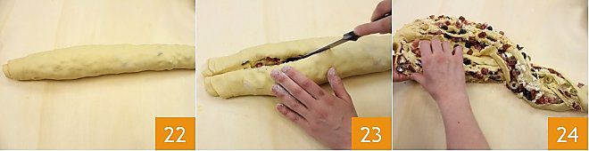 Roll until you get a roll 22. Cut the roll in half with a thin bladed knife 23 and floured (so it doesn't stick to the dough), then separate the two parts and twist them, keeping the cut side up to reveal the sections and its filling 24.