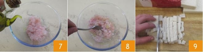 Finely chop the scampi with a knife 4, then place them in a bowl and grate the lemon zest 5, then squeeze the juice, filter it, and pour it over the fish 6.