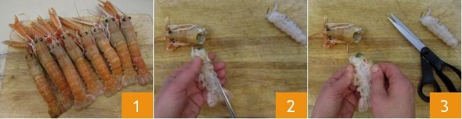 To prepare the tart in a glass, start with the scampi tartare: take the scampi 1, cut off the head with scissors and open the shell to extract it (2-3), then remove the internal filament (the intestine) by pulling it out with a sharp knife.