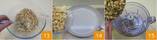 Mix everything 13 and pour into a non-stick pan 14 for at least 10 minutes until everything becomes crispy. Once golden, pour it into a blender 15 and blend to obtain a crumble.
