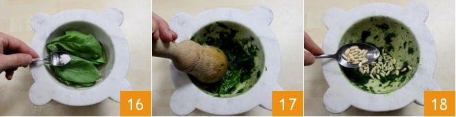 Lastly, prepare the pesto: in a mortar (or a blender), place the peeled garlic, basil leaves cleaned with a dry cloth, and salt 16. Start pounding 17, pressing the basil against the mortar walls, rotating the pestle from left to right while simultaneously rotating the mortar in the opposite direction (from right to left). Continue until a bright green liquid comes out of the basil leaves 18, at which point add the pine nuts and start pounding again to reduce to a cream. Add the cheeses little by little, stirring constantly, which will make the sauce even creamier, and finally, the extra virgin olive oil, drizzled in while stirring with the pestle. Mix the ingredients well until a homogeneous sauce is obtained.