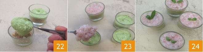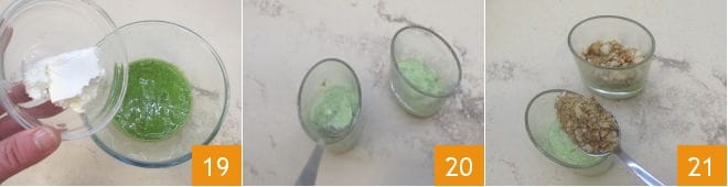 Add the robiola to the obtained cream 19, mix thoroughly and take 6 glasses with 80 ml capacity. Start layering with a layer of pesto 20, one of toasted bread 21,