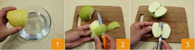 To prepare the apple and carrot cake, start by preparing the acidulated water to prevent the apples from browning once you've sliced them: squeeze the juice of 1 lemon 1, strain it, then pour it into two bowls with cold water. Rinse the green apples under fresh running water and then peel them 2; cut an apple into quarters and remove the core with an apple corer 3.
