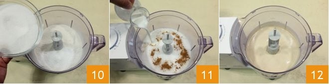 Pour in the sugar 10, ground cinnamon, and milk in a slow stream 11, then turn on the mixer until you get a thick and homogeneous mixture 12.