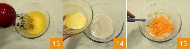 In a separate small bowl, separate the egg yolks from the egg whites, setting the latter aside; beat the yolks 13 with an electric mixer and add them to the mixture you obtained 14 along with the grated carrot 15.
