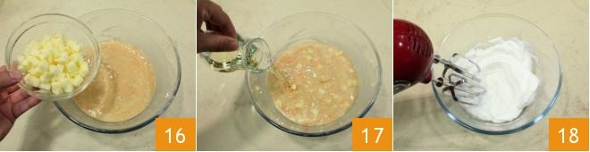 Add the well-drained apple cubes from the acidulated water 16 and then the oil in a slow stream 17, stirring well with a spatula to combine all the ingredients. In a separate bowl, beat the reserved egg whites with an electric mixer or hand whisk 18;