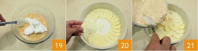 when the egg whites have become white and foamy, incorporate them into the mixture stirring with the spatula from the bottom upwards 19. At this point, butter and line a 9-inch diameter cake pan with parchment paper and then cover the entire base with the thin apple slices (well-drained from water and lemon) side by side, covering the whole surface evenly 20. Once finished, gently pour the mixture 21.