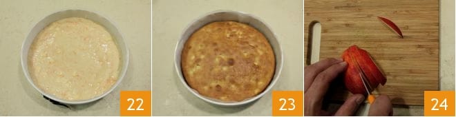 Level the batter well with the help of a spatula 22 and then bake in a preheated static oven at 340°F for 60 minutes (or 300°F for 50 minutes if using a convection oven): if the surface of the cake darkens too much, cover it with parchment paper or aluminum halfway through baking. Once cooked 23, remove from the oven and let it rest in the mold for 5 minutes; then remove it and place it on a wire rack to cool completely. Now you can proceed to decorate: rinse the red apple under fresh running water, cut it in half without peeling it, and then into slices 24.