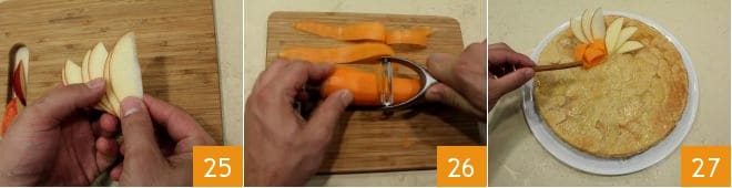 Once the apple is sliced 25, take the carrot and use a peeler to make very thin slices 26. When the cake has cooled completely, decorate it as you like with the red apple slices, the carrot, and the cinnamon stick 27. Finally, serve and enjoy the apple and carrot cake.