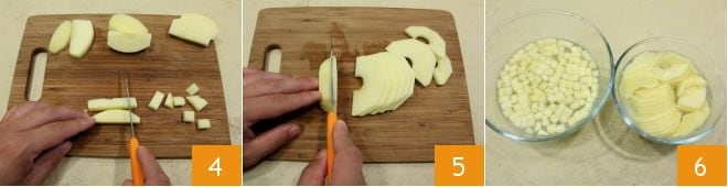 Cut the apple into cubes 4, placing them in the bowl with water and lemon as you cut them, and then take the second apple, slice it into thin slices 5, also putting them in water and lemon 6.