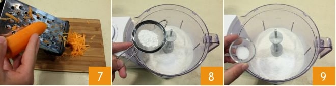Wash and peel the carrots, then grate them 7 and set aside. In a mixer, place the sifted flour together with the baking powder 8 and then add a pinch of salt 9.