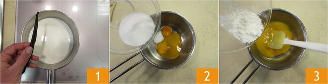 To prepare the apple and cream tart, first make the latter. Take the vanilla pod that will be used to prepare the shortcrust, empty it of seeds and set them aside. In a saucepan, pour the milk and the emptied vanilla pod 1. Turn the flame to low and bring the milk to a boil. Meanwhile, in another saucepan, combine the egg yolks with the sugar 2 and stir gently with a spatula. Then add the corn starch 3.