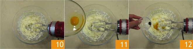 Work with electric whisks until you get a cream 10, add the whole egg 11, the vanilla pod seeds 12, and work until fully absorbed.