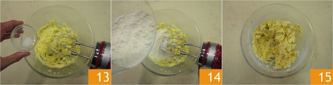 Add the egg yolk and work again with the whisks. Add the salt 13, the flour 14, and work again until you have obtained a soft and homogeneous mixture 15.