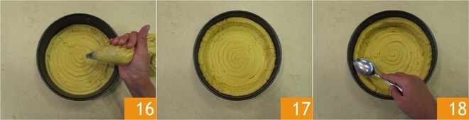 Transfer the dough into a piping bag with a smooth nozzle and create the base of the shortcrust shell inside a 9-inch mold 16. Once the base of the mold is covered with the shortcrust, create the edge by overlapping 3 layers of shortcrust 17. Level the edge gently with a spoon to make it more uniform 18. Transfer the shortcrust shell to the fridge until use.