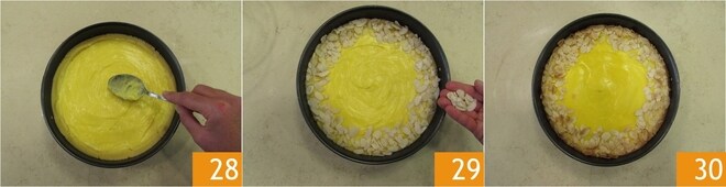 Level with a spoon 28 to smooth the surface. Add another 1 oz of sliced almonds on the edges and bake in a preheated static oven at 350°F for 45 minutes. When it is well browned, take it out of the oven 30.