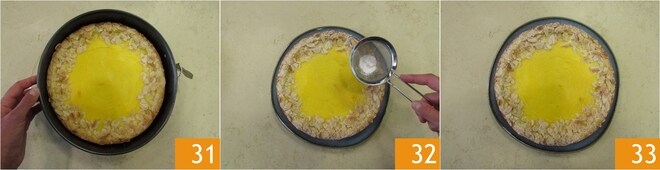 Let it cool completely before unmolding the dessert 31. Decorate with powdered sugar on the edges 32 and serve your tart 33.