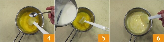 Stir again until you get a homogeneous mixture and add a pinch of salt 4. Stir again, then pour in the hot milk slowly 5, stirring 6.