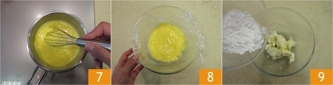 Return the cream to the heat and stir until it thickens 7. Then transfer to a bowl, cover with plastic wrap in contact 8, and let it cool. Move on to the shortcrust. In a bowl, pour the soft butter and powdered sugar 9.
