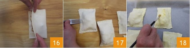 Fold the pastries in half 16 and align all the edges. Seal them with the tines of a fork 17 to prevent the filling from leaking during cooking. At this point, the pastries are ready: place them on a baking sheet lined with parchment paper and brush the surface with the remaining beaten egg 18. Finally, bake in a preheated static oven at 428°F for about 12 minutes (if using a convection oven, 392°F for about 8 minutes: we suggest testing the cooking of one pastry to better gauge the others).