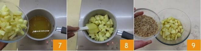 Once the sugar is dissolved, add the apples 7 and let them soften over very low heat for 15 minutes, continuing to stir 8. The apple should not completely disintegrate by the end of cooking but remain sufficiently soft. When ready, transfer to a bowl, let cool slightly, then add the hazelnut crumbs 9.