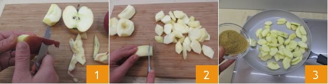 To prepare the apple crumble with chocolate sauce, start with the apples. Wash them, peel them 1, cut them into wedges, and then into slices along the shorter side 2. Transfer the apples to a saucepan, add the brown sugar 3