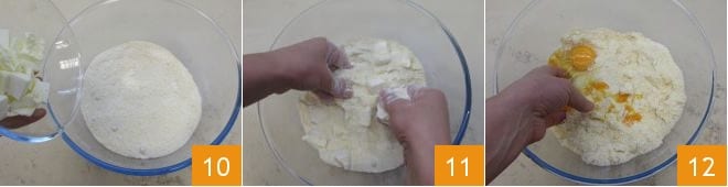 Finally, add the butter cut into cubes 10 cold from the refrigerator and start kneading quickly pinching the dough 11 so as not to warm it too much. Add the egg yolk and the whole egg 12