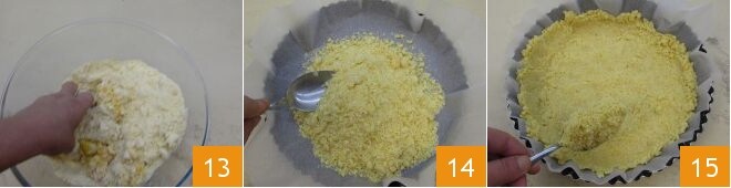 and continue kneading 13 until you obtain a crumbly mixture. Transfer just over half of the dough into a 9-inch (22 cm) pan lined with parchment paper 14 and gently press it with the back of a spoon to spread it over the entire surface, including the edges 15.