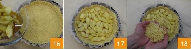 Pour the apples into the mold 16, arrange them evenly 17, and cover with the remaining dough 18.