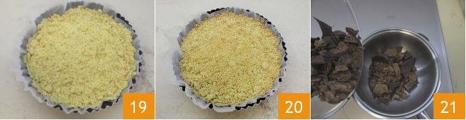 This time it won't be necessary to press with the spoon but just cover the entire surface with crumbs without leaving gaps 19. Bake the crumble in a static preheated oven at 350°F (180°C) for 30 minutes (or in a fan oven preheated at 320°F (160°C) for about 25 minutes). Remove the cake from the oven 20, let it cool, and in the meantime, prepare the chocolate sauce. Coarsely chop the dark chocolate and melt it 21 in a double boiler, stirring often.