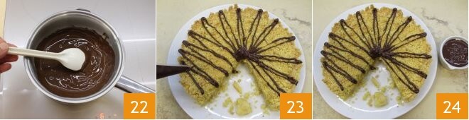 Once the chocolate is completely melted 22, transfer some into a piping bag and decorate your cake according to your taste 23. Serve the apple crumble with the remaining chocolate sauce 24.