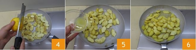 the zest of half an orange 4 and the juice 5. Let it cook this way for about 10 minutes on low heat: the apples should not fall apart but remain crispy 6. Then transfer them to a bowl and let them cool.