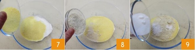 Now move on to preparing the crumble: combine all-purpose flour, cornmeal 7, almond flour 8, and sugar 9 in a bowl.