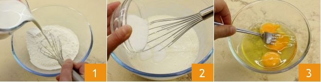 To prepare apple pie crepes, start with the crepe batter. Pour the sifted flour into a bowl, add the milk 1, and mix. Then, add the sugar 2 and a pinch of salt. Work the mixture with a hand whisk until smooth and lump-free. In a separate bowl, beat the eggs 3