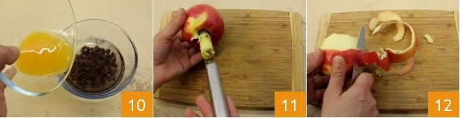 then add the orange juice 10. Proceed to prepare the apples: remove the core with a corer 11, then peel them 12