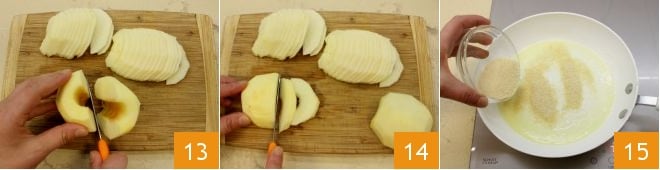 and cut them in half 13, then slice them thinly, about a quarter inch thick 14; as you slice them, you can place them in a bowl of cold water and lemon to prevent browning, and then drain them well before cooking. In a large pan, melt the butter, add the brown sugar 15, and stir briefly with a spatula.