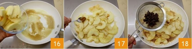 and stir briefly with a spatula. Then add the apple slices 16, stir and caramelize them, sprinkle with cinnamon 17. Cook for a few moments, then drain the raisins reserving the soaking liquid and add them to the apples 18. Also, pour in 2 tablespoons of the liquid in which you soaked the raisins and cook over medium heat