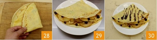 Further fold each crepe into a triangle 28 and once ready 29, decorate it with the chocolate ganache before serving 30. Your apple pie crepes are ready to be enjoyed!