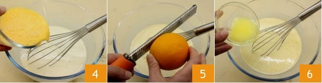 and add them to the batter 4. Also, add the zest of an orange by grating it directly into the bowl 5 and continue to mix, then add the melted butter 6,