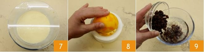then cover the batter with plastic wrap 7 and let it rest for at least half an hour in the fridge. Meanwhile, squeeze the orange juice 8 and strain it. Then, rinse the raisins and soak them in warm water to rehydrate 9,