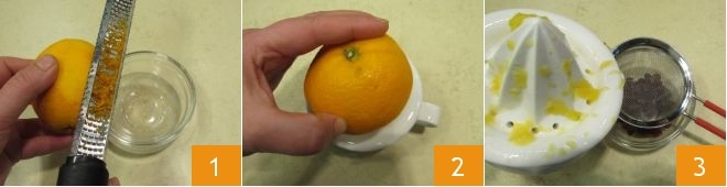 To prepare the apple puff pastry tarts, first start by grating the peel of an orange 1 and set it aside; then squeeze the juice 2 and pour it over the raisins (already rinsed under running water) collected in a small bowl, filtering it with a sieve 3.
