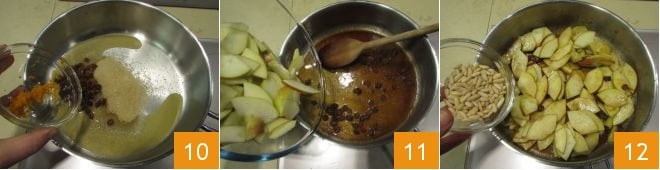 Flavor with the previously grated orange peel 10 and cinnamon powder, add the apple slices 11 and pine nuts 12, and sauté everything over medium heat for a few minutes, stirring occasionally.