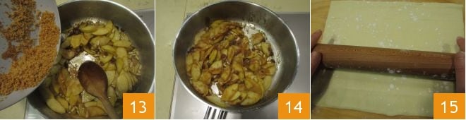 Let the apples caramelize and become flavored for about 8-10 minutes, then add the toasted breadcrumbs to the pan with the apples 13 and turn off the heat 14. At this point, slightly roll out the puff pastry with a rolling pin 15.