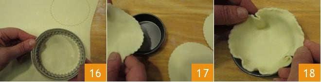 Cut out 7 discs with a fluted pastry cutter, with a diameter of 4 1/3 inches 16. Take tart molds with a diameter of 3 1/3 inches and a height of 3/4 inch, lay the pastry discs in each mold (17-18) making sure to adhere well to the bottom and the edge.