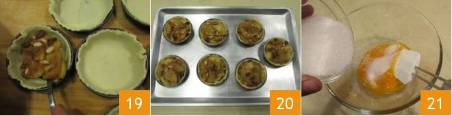 Fill the tarts with the now lukewarm apple filling 19, place them on a baking sheet 20, and bake for 25 minutes in a preheated static oven at 356°F. In the meantime, prepare the custard that will accompany your tarts: pour the sugar into the bowl with the yolks and mix with a spatula 21,